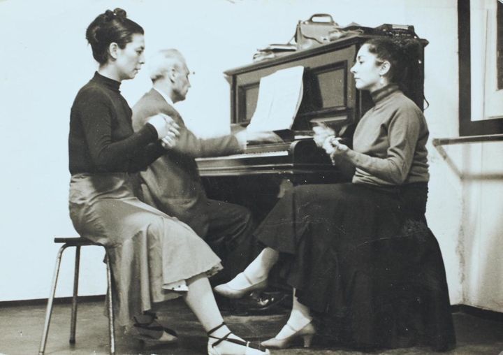 レッスン場でフラメンコの指導をする小松原さん。普段の柔和さから一転、90代とは思えない凛とした叱咤の声が飛ぶ。