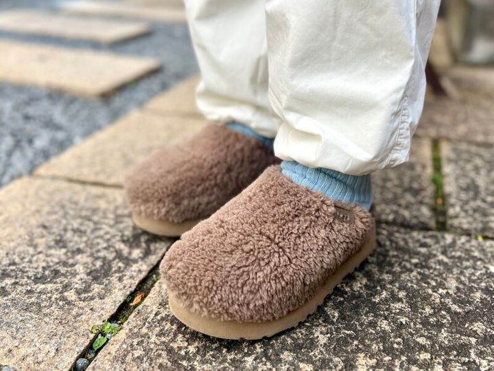 ニットとお揃いの「イレブンセカンド」の靴下をちらりと見せて。「アグ」のボアサンダルと、鉄板のチョコミントカラーでコーディネート。