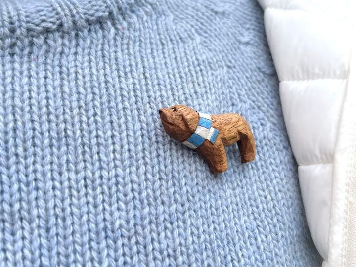 京都の冬に映えるきれいなアイスブルーのニットは「eleven 2nd(イレブンセカンド」のアルパカニット。「カシミアよりも暖かいので真冬は手放せない」という郡司さんは色違いで5枚持っているとか。小さな木彫りのブローチは木工作家・江籠正樹さんの作品。なんて愛くるしい表情!