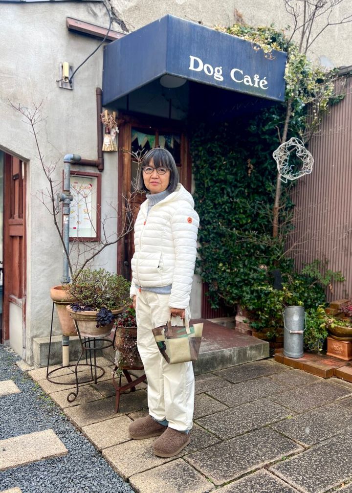 白ベースに、アイスブルーとモカ茶の色の効かせ方がとても素敵な郡司さん。ふかふか暖かそうなダウンは、「100%アニマルフリー」を掲げるサステナブル・ヴィーガンウェアブランド「セーブ・ザ・ダック」のもの。パンツは「ユニクロ」キッズサイズのウォームイージーパンツ。「裏地がフリースなので、めちゃくちゃ暖かくて重宝してます」。