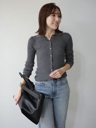 基本的に素材の良さを引き立てる無地が一番得意なので、柄トップスを取り入れるときは、編み目の細かいニットや襟もとの開いたデザインできちんと感とスタイリッシュさを足していきましょう。