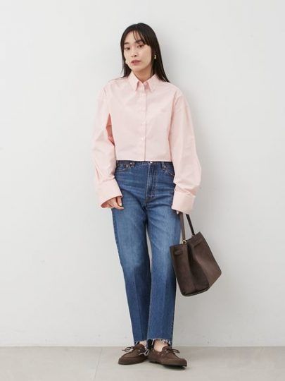 デニムは、腰まわりをカバーしながら美脚効果を叶えるテーパードシルエットがおすすめです。トップスは、清潔感のあるカラーシャツをあわせて上品さをプラスしましょう。足元は、ローファーやパンプスを合わせると、足の甲がちらりと見えて抜け感が出ます。
