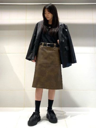 骨格ストレートタイプのハリ肌に相性がいいレザー素材は、スカートで取り入れると女性らしく着こなしやすいです。