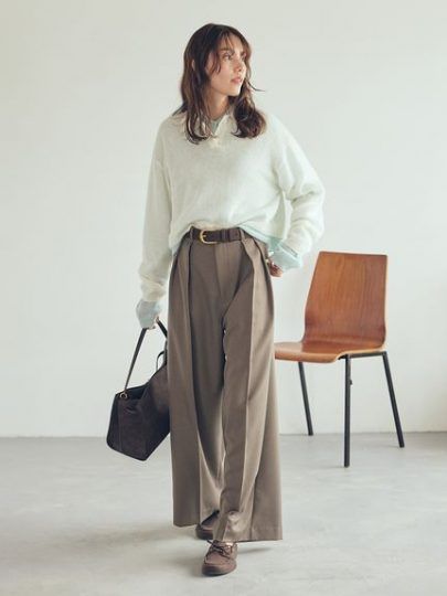 タックワイドパンツ×スキッパーラインニット