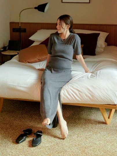 ビスチェ付きニットワンピース×ロングネックレス