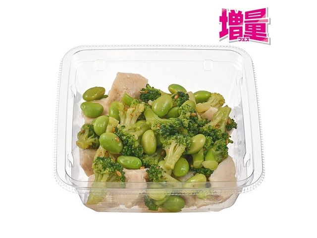 低温調理チキンとブロッコリー、枝豆を塩だれソースで味付けした、おつまみにもぴったりのサラダです。期間限定で総重量を39%増量しました。 取り扱い店舗 全エリア