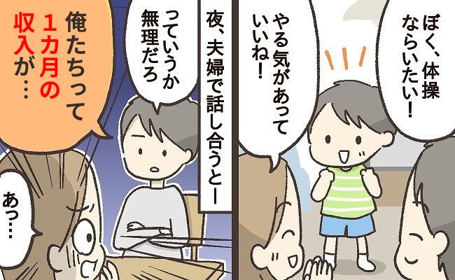 わが家の月収は夫婦2人合わせて25万円ほどなので難しいと夫に現実を突きつけられました。たしかに冷静に考えると、これ以上の金額を習いごとに割く余裕はありません。息子には「まずはスイミングを頑張ろう」と伝えて、体操はあきらめてもらうことに。