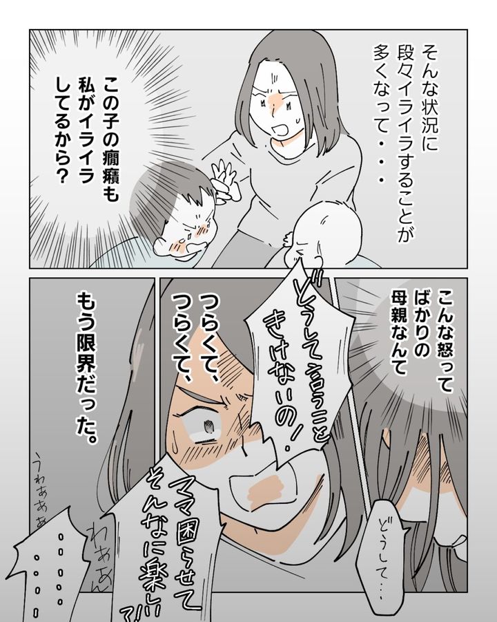 そんな状況に段々イライラすることが多くなり、「この子の癇癪も私がイライラしてるから?」と考えるように。そして、「こんな怒ってばかりの母親なんて」と思ったナオは子どもに「どうして言うこと聞けないの!ママ困らせてそんなに楽しい!?」と冷たくあたり、「つらくて、つらくて、もう限界だった」とその時のことを話したのでした。