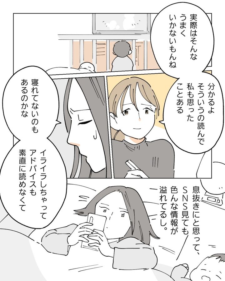 「実際はそんなうまくいかないもんね。分かるよ。そういうの読んで、私も思ったことある」私がそう言うと、「寝れてないのもあるのかな。イライラしちゃって、アドバイスも素直に読めなくて。息抜きにと思ってSNS見ても色んな情報が溢れてるし」とナオが言いました。