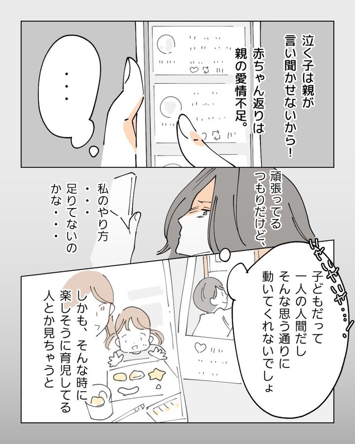 「泣く子は親が言い聞かせないから!」「赤ちゃん返りは親の愛情不足」ネットでそう書かれているのを見て、何も言えなくなったナオは、「頑張ってるつもりだけど、私のやり方、足りてないのかな?」と考え込んだり、「いやいやいや!子どもだって一人の人間だし、そんな思う通りに動いてくれないでしょ」でしょって思ったりしてて、そんな時に楽しそうに育児してる人とか見ちゃうと、