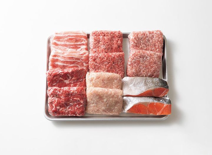 牛切り落とし肉、豚バラ薄切り肉、鶏や豚のひき肉、合いびき肉は、多めに買い、買ってきたらすぐ1人分80~100gに分けて冷凍しておきます。魚は切り身を。