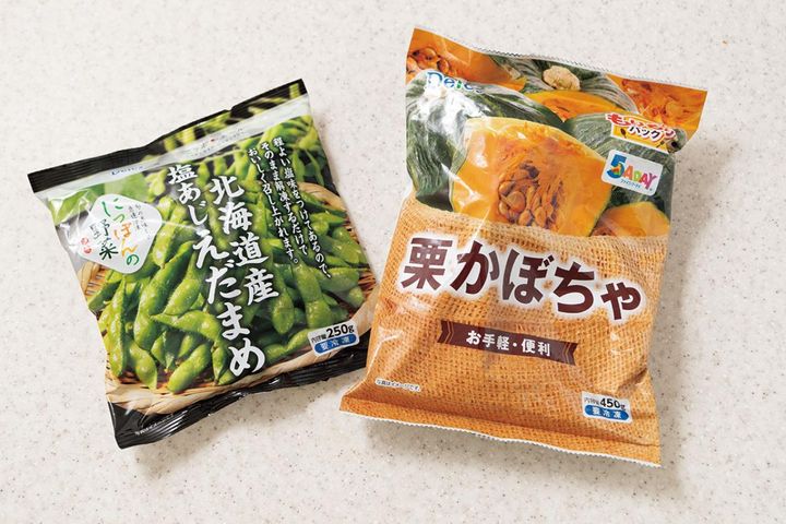枝豆はたんぱく質源でもあり、冷凍枝豆はひき肉とまぜて焼いたり、料理にちょっと青いものがほしいときに加えたり。冷凍栗かぼちゃは、ほくほくしているのでお菓子作りに。