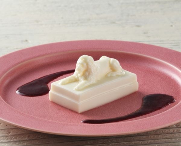 〈柏屋つちや〉ブランあんジェ「風に立つ」486円 三越の象徴的存在としても、待ち合わせ場所としても親しまれている“ライオン像”をかたどったやわらかな水羊羹。ローストアーモンドで香り付けしたミルクに白餡を合わせた洋の味わいを楽しめる一品。甘みと酸味のバランスが上品なカシスソースを添えて楽しめます。