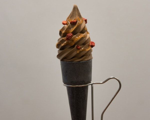 〈アンフィニ〉能登産いちごのチョコソフト 770円 濃厚なチョコレートソフトクリームと相性抜群な、フリーズドライいちごと、能登産いちごを使った甘酸っぱいソースをトッピング。竹炭が練り込まれた最中皮コーンの底には能登大納言小豆のつぶ餡が入っているクールスイーツです。