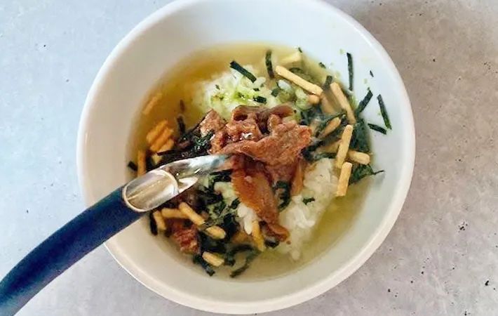 ご飯に合う甘辛い牛しぐれ煮をのせるだけで、いつものお茶づけがぐっとぜいたくになりました。
