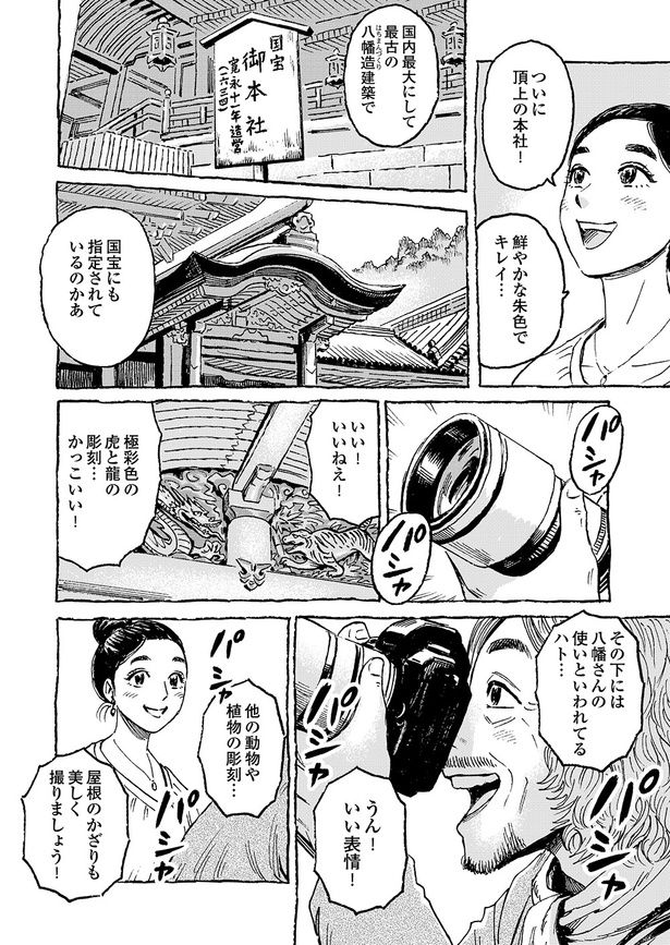 最大の見どころは、国宝に指定されている豪華絢爛な本殿。徳川家光が再建した「八幡造」の建築美や、随所に施された精緻な彫刻には目を見張る。作中でカメラマンの勝間さんが注目したのも納得だ。