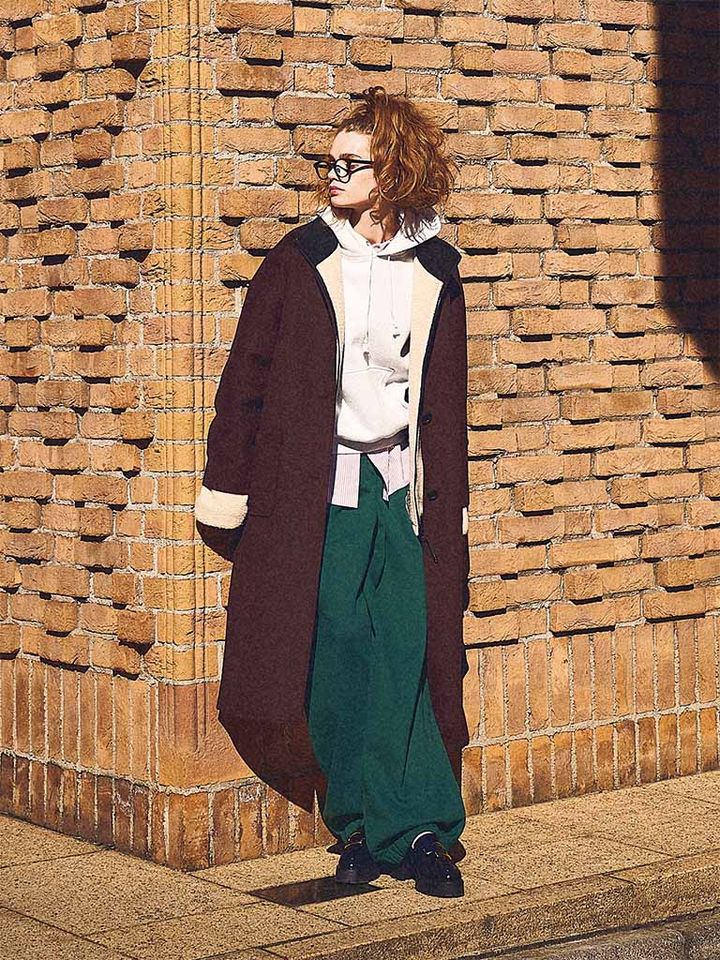【POINT】スウェットの上下を手抜きに見せない長いウールコートの品格。長いコートがボリュームを流し、たくさん重ねても見た目はすっきり。