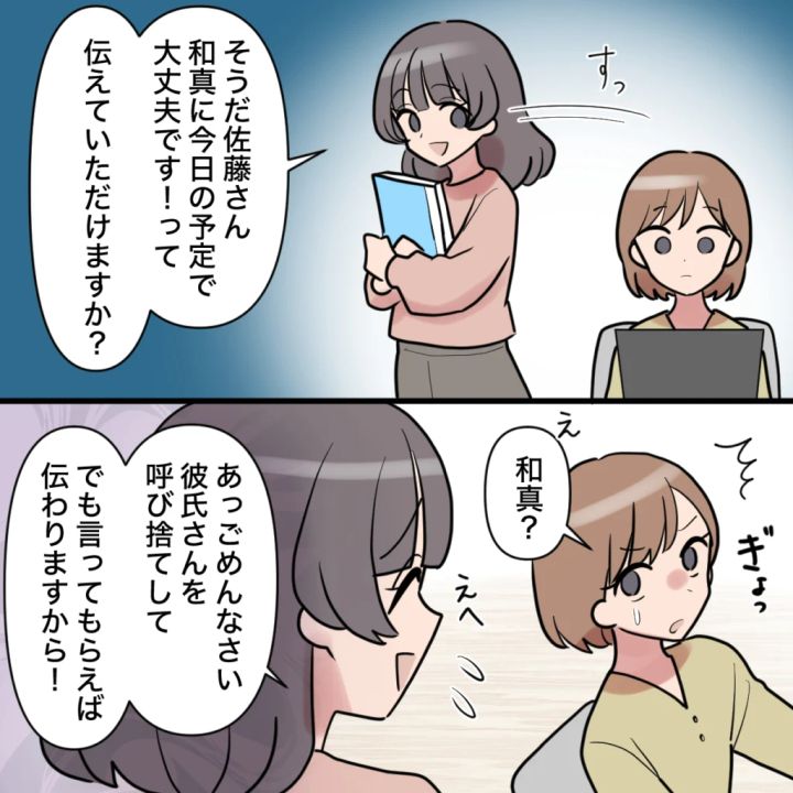 自分の仕事に集中していると、田中さんが私の後ろを通る際に「佐藤さん、和真に今日の予定で大丈夫ですって伝えていただけますか?」と言ってきました。「和真?」思わず反応してしまった私。だってそれ、同棲している私の彼氏ですけど?怪訝な私の顔を見て、田中さんは「あっごめんなさい彼氏さんを呼び捨てして」と慌てて言いましたが、さらに「でも言ってもらえば伝わりますから!」と意味深に言われてわざとだな、と思いました。