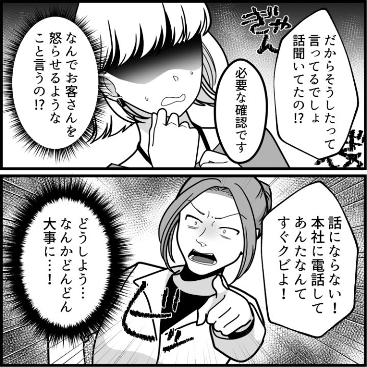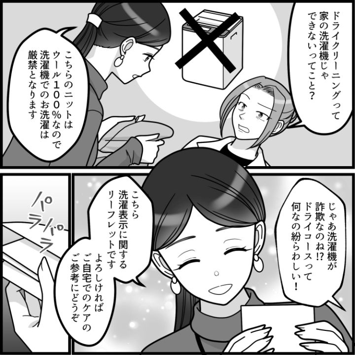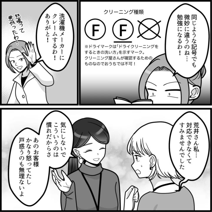 アパレル会社に新卒入社したゆうか。毎日さまざまな事を先輩に教わりながら、仕事を覚えていっている。そんなある日、いきなり激怒したお客様が来店する。そして「ニットが縮んだから返金しろ!」と怒鳴り始めたため、クレーマー対応に怯えてしまうゆうか。しかしここで先輩社員が登場し、なんとスカッと急展開に!?
