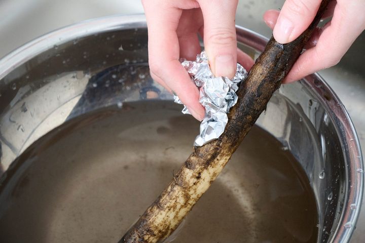 アルミホイルでごぼうを擦ることで優しく汚れを落とすことができ、ごぼうのもつ香りを残して料理に使うことができます。
