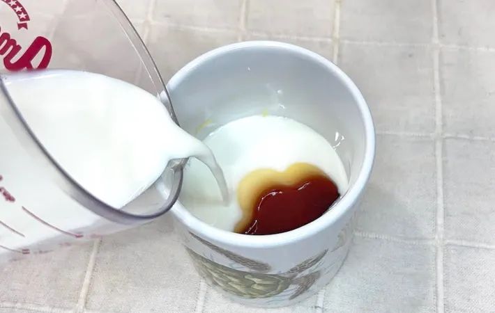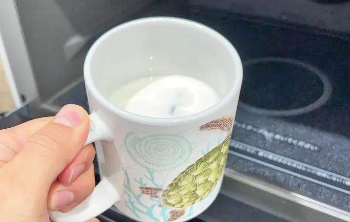 次に、マグカップに牛乳を注ぎます。この時、あふれないように少し大きめのマグカップを使うと安心でしょう。