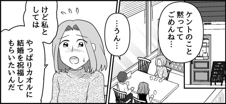 私はカオル。20代半ばで夫と結婚し、現在は娘と息子と4人で暮らしています。ある日、大学時代の親友エイコから「40代にして結婚しました」という連絡が来ました。その相手は学生時代に私の元カレだったケント。話を聞いて気分が悪くなった私は、「おめでとう」を撤回しました。けれど「どうしても理解してもらいたい」と、悲劇のヒロイン気取りで追いすがってくるエイコ……。私は大学の同級生、イチカに立ち会ってもらい、3人で会うことにしました。