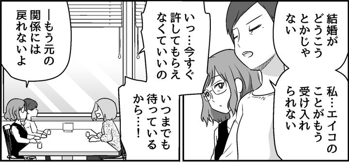イチカに同席してもらって、エイコと直接対面した私。しばらく話を聞いていましたが、エイコは今あんまり幸せじゃないのでしょう。だから過去のことを私にわざわざ明かして許しを得て、心から祝福してもらいたいのです。
