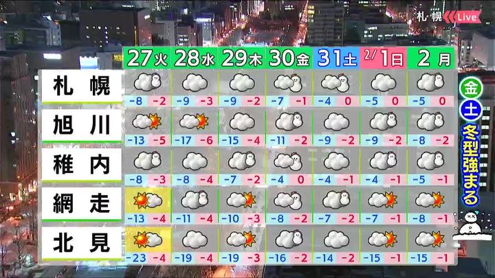 留萌地方は午前を中心に5~10センチの雪が降るでしょう。内陸は日が差す見込みです。けさの富良野はこの冬一番となる-26.7度まで冷えましたが、あす27日(火)は‐19度でしょう。