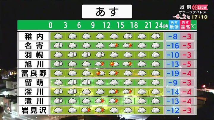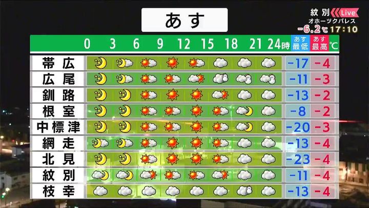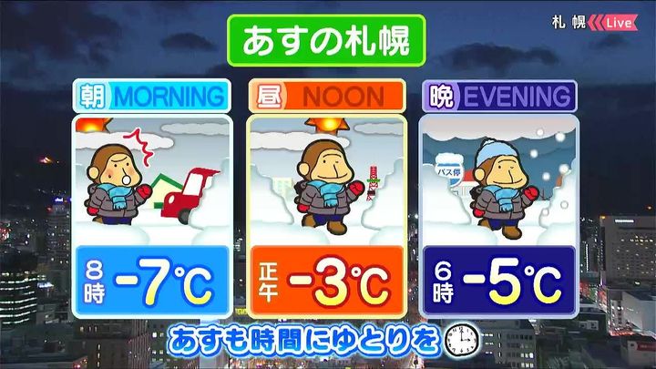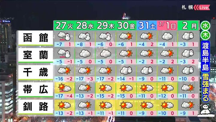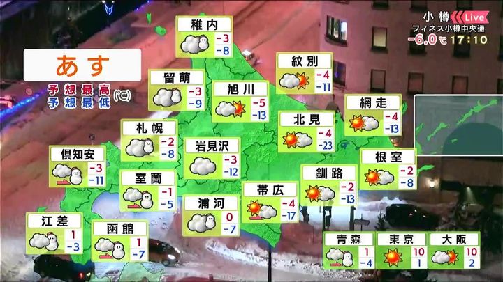 日本海側や道南で雪が降るでしょう。最低気温は札幌でけさより4度ほど高い‐8度です。最高気温は函館で1度と、道内1週間ぶりにプラスの気温になりそうです。