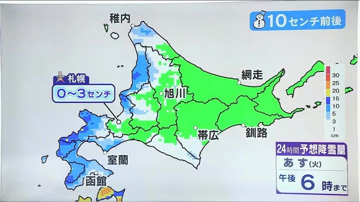 大雪にはならない見通しです。あす午後6時までの24時間で濃い青色、留萌や後志、渡島半島の多いところで10センチ前後でしょう。記録的な大雪となった札幌も雪の量は少ないいですが、大雪の影響は残るので、あすも時間にゆとりを持って出かけましょう。