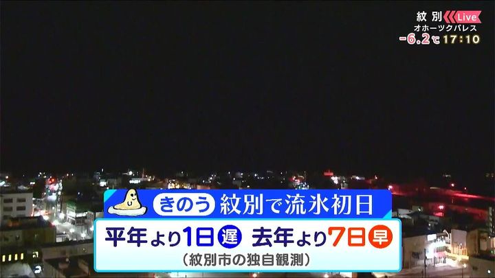 紋別市の独自観測によると、きのう陸地から流氷が初めて見られる流氷初日となりました。斜里町では接岸しています。