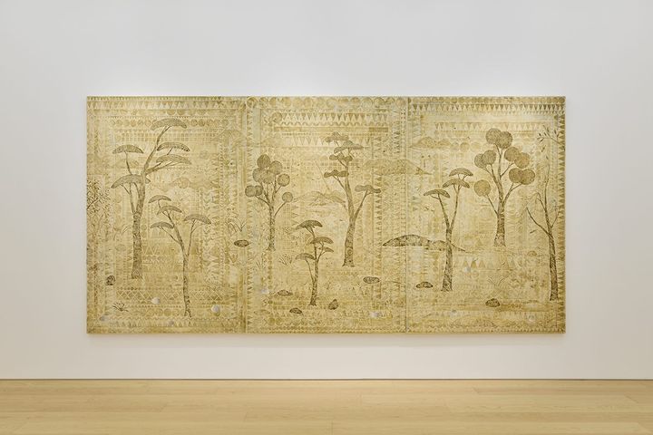 展示風景より、《光をなぞる手つき A Gesture that Traces the Light》(2026)。193.9×390.9㎝(3点組)の大型の作品だ。 photo: Kenji Takahashi