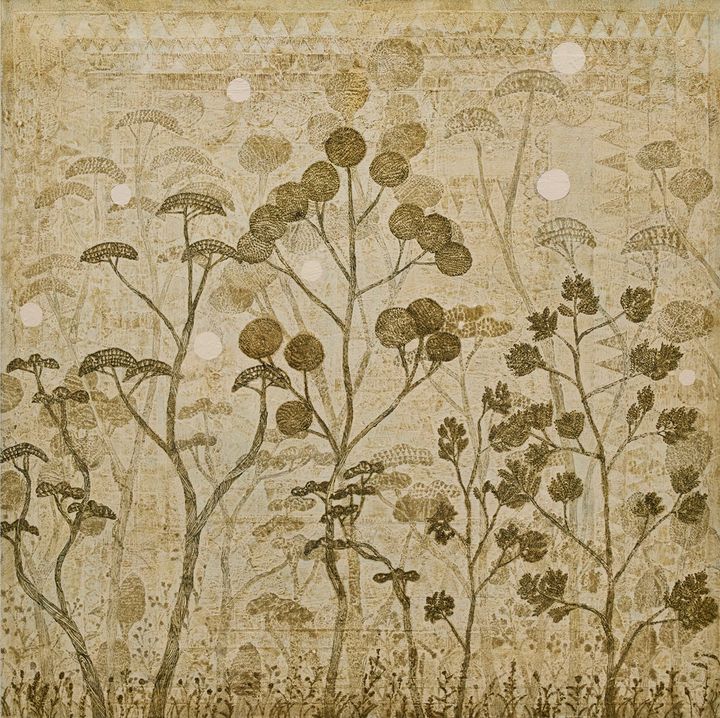 風能の作品は一見すると静かで穏やかだ。緻密な文様、幾層にも重なった色彩、木々や月、ドアや窓のようなかたちに、生き物たち。だが、その奥には、描いては覆い、削り、また描くという制作の時間が確かに刻まれている。その色相もあいまって、化石や地層のような質感や世界を思わせるのも魅力だ。