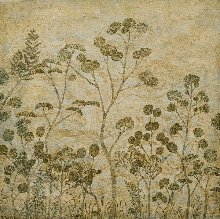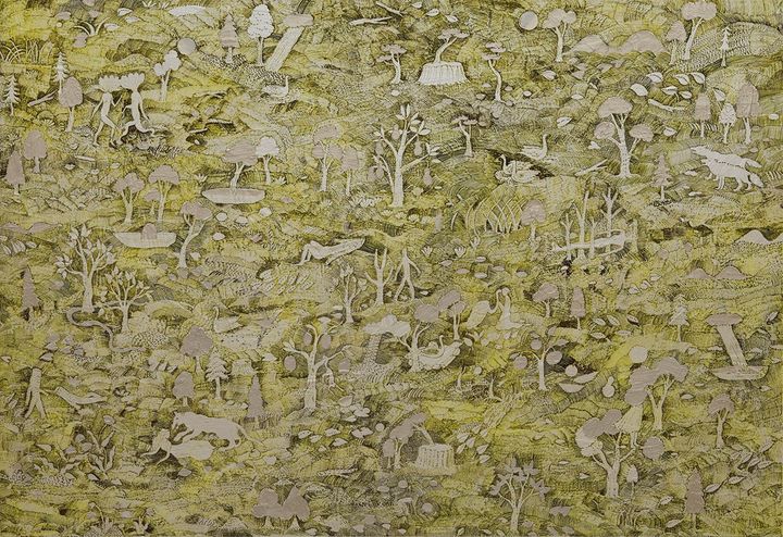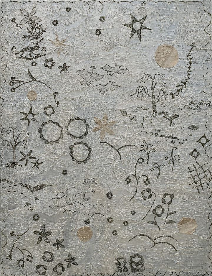 作品は主にアクリル絵の具で描かれているが、その印象は一般的に想像される軽快さや即物的な質感とは大きく異なる。一度描いた絵の上から異なる絵を描き、何層にも絵の具が塗り重ねられていく。その後、熱ペンによって削られ、下層の色がわずかに顔を出す。その繰り返しによって生まれる細かな線や凹凸は、糸を重ねる織物や、針を進める刺繍のようでもあり、また、釉薬をまとった磁器のように、密度が高くどこかしっとりとした光を帯びている。