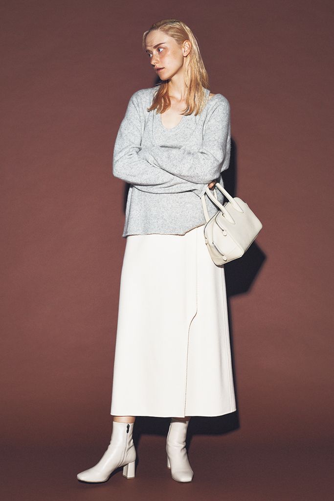 ミニマルな色づかいで統一感や大人っぽさを出せるだけでなく、縦のラインが強調されて脚長見えもかなえるうれしい効果。ボリュームが出やすいこれからの、すっきり感にも一役。トップスにも白っぽいグレーを選び、色数を極力セーブ。 白メルトンスカート/ebure(LITTLE LEAGUE INC.) 白ショートブーツ(6.5)/ダイアナ(ダイアナ 銀座本店)