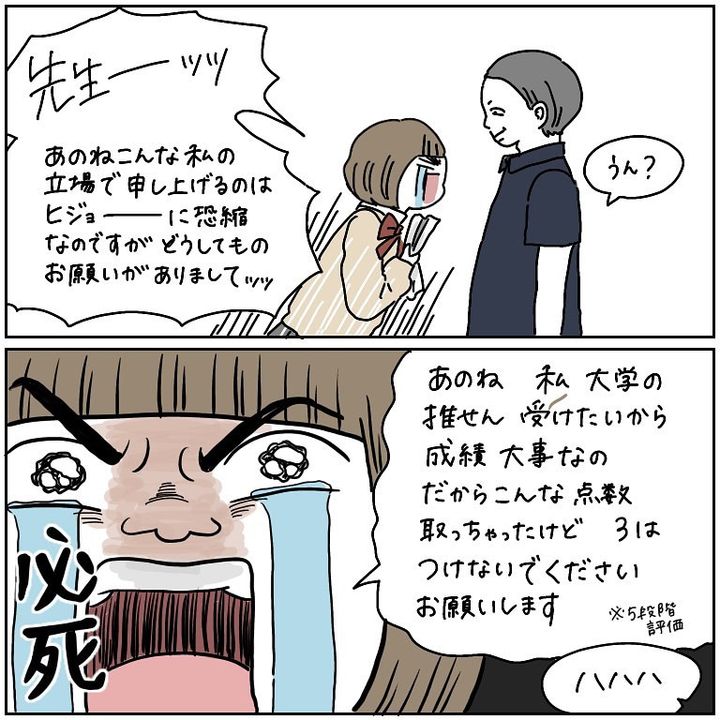 こんにちは!Instagramで日々の暮らしを漫画で紹介している、Web漫画家のmomoです。高校生のとき、数学のテストで見事に赤点をとりまして(泣)。数学の先生と仲が良かったので、「ここは情に訴えるしかない」と泣いて懇願(必死)。その結果、「大丈夫」という優しい言葉をいただいたんです(嬉)。しかし、わたしを待っていたのは予想外の結末…(驚)。詳しくは漫画をご覧あれ。