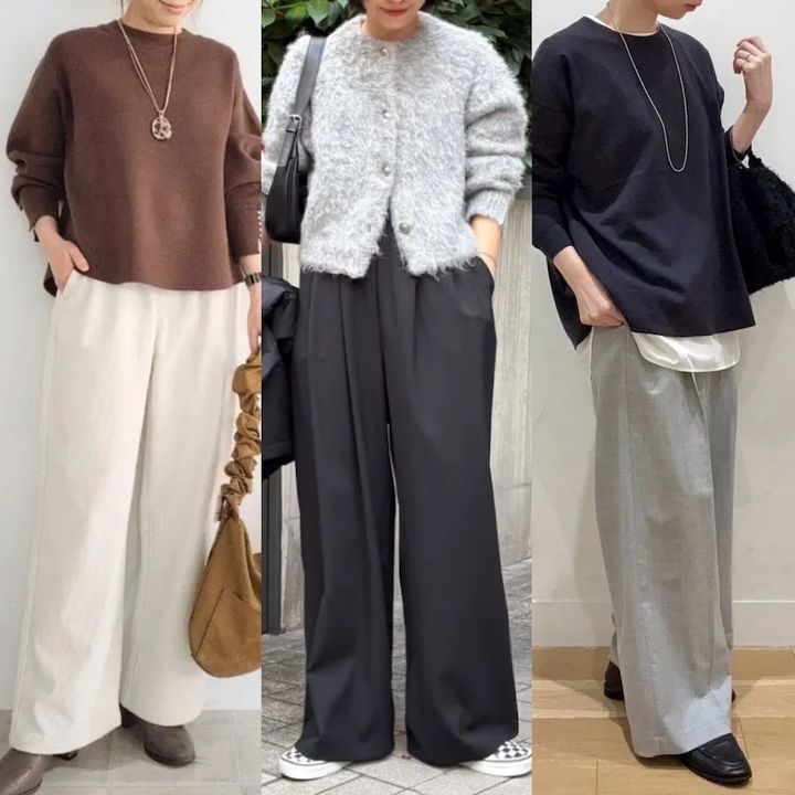 チャコールグレーのニットに、ライトグレーのタック入りイージーパンツを合わせて、グレーの濃淡でまとめたコーディネートです。