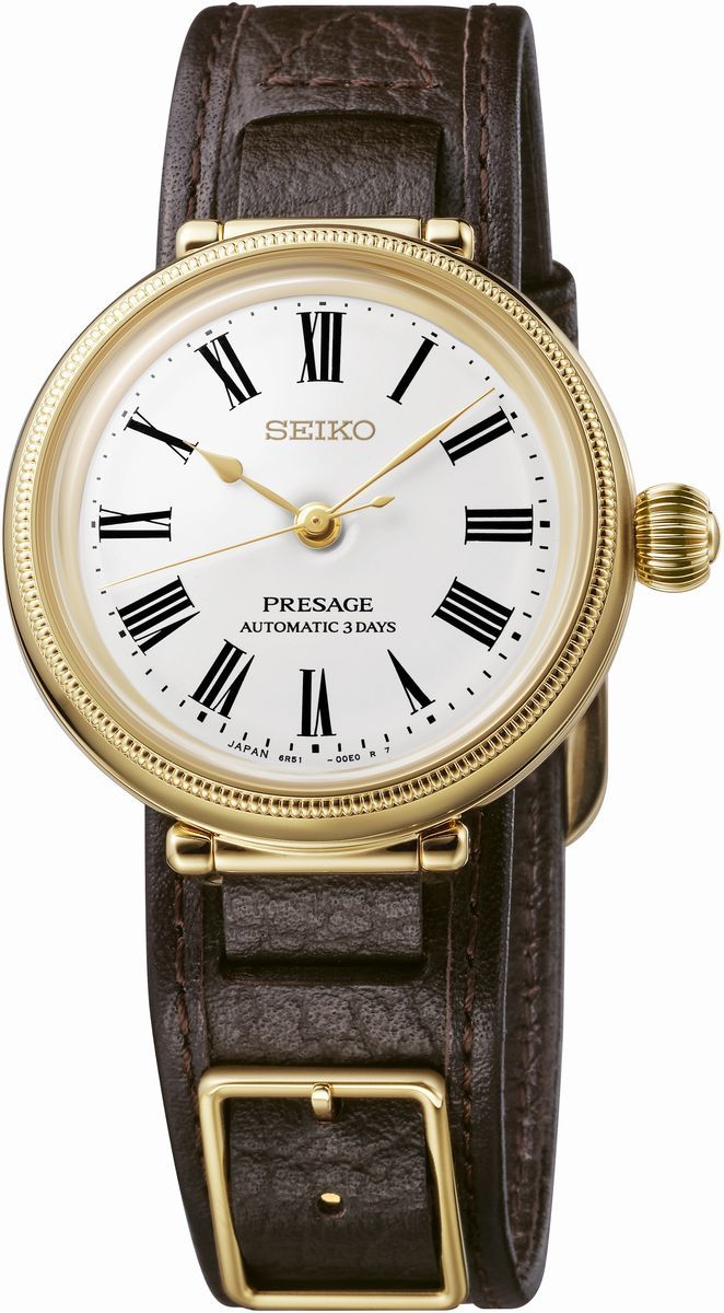 セイコー プレザージュの「クラシックシリーズ クラフツマンシップ 琺瑯ダイヤル限定モデル」は、時計の製造工場「精工舎」の創成期に作られた懐中時計「タイムキーパー」をオマージュしたモデル。ゴールドカラーのベゼルに立体的で緻密な装飾を施し、玉ねぎのような形のりゅうずはそのままに、細身のローマ数字インデックスは、視認性の高い書体へアップデートしている。