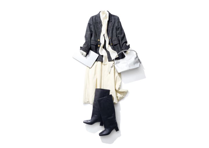 ボウタイブラウス¥19,800/Stola. ジャケット¥17,990/ANYSIS(オンワード樫山) パデッドスカート¥9,990/アンフィーロ(オンワード樫山) シルバーバッグ¥15,400/Stola. ロングブーツ¥79,200/ファビオ ルスコーニ(エリオポール代官山)