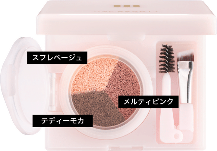 ところで、みなさん「なんだか眉が年齢とともに太く、そして黒くなった?」と思ったことありませんか? これは加齢により、毛周期の変化やホルモンバランスの乱れなどが原因。でも、顔の印象の8割を決めるのは「目」。ここにエイジングサインが出ていたら、いっきに老け見えということになりかねないわけです。そこで、オススメしたいのがこのクッションブロウ! スフレベージュ、メルティピンク ディープモカの3色をブレンドして、自分に合ったふんわり「軟毛眉」を作れるんです。