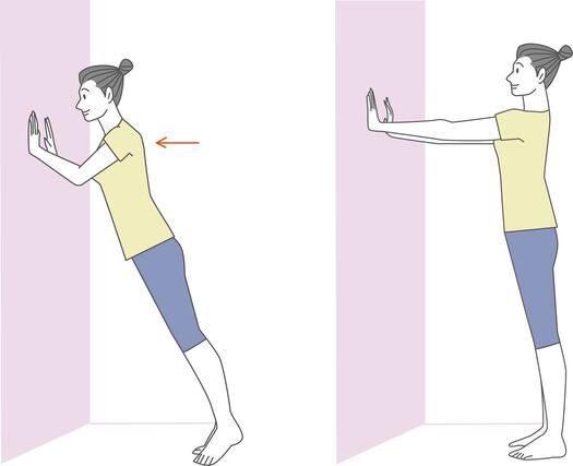 (2) 両手のひらを壁につけ、肘を曲げて体を壁側へ倒す。