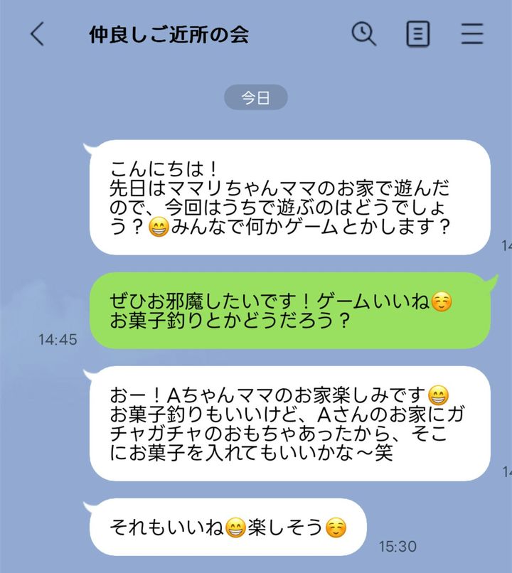遊ぶメンバーでのグループLINEでの会話だったので、その後Aちゃんママが「いいねー楽しそう😄」と賛成してくたのですが