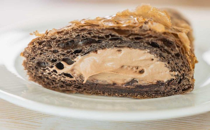 厚みのあるパイ生地は、ふかふかでふんわりとした柔らかな食感です。中のチョコホイップクリームも、ふわふわとした軽やかな舌ざわりに。そこにチョコチップの食感が加わることで、よいアクセントになっています。