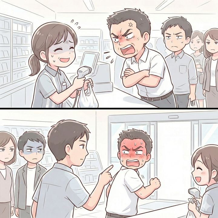 レジ前まで詰め寄り、カウンターをバンと叩く男性。店内が静まり返る中、私は謝ろうとしましたが、恐怖で言葉が出てきません。