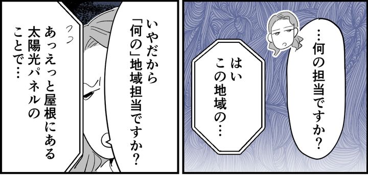 モニターにうつる男性たちの風貌から「あ、セールスじゃない?」と思いました。話を聞くと「屋根にある太陽光発電パネルのことで……」とのこと。セールスだとわかった私は「今から出かけるので対応はできません」と言ってインターホンを切りました。そして出かけようと振り返ると、私を見て微妙な顔をしている2人。