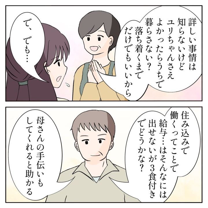 「詳しい事情は知らないけど、ユリちゃんさえ良かったらうちで暮らさない?落ち着くまでだけでもいいから」母さんの言葉に「で、でも・・」と躊躇するユリ。すると、「住み込みで働くってことで。給与・・はそんなには出せないが、3食付きでどうかな?母さんの手伝いもしてくれると助かる」と父さんが笑顔で言いました。