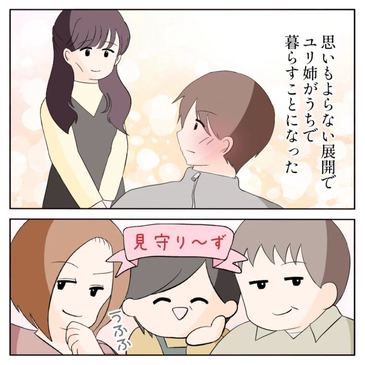 一緒に暮らすことになったことをこっそり見守る家族が3人
