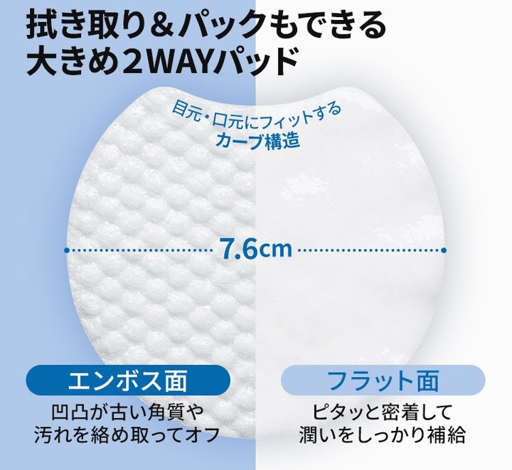 肌表面の古い角質を緩めて拭き取りやすくする「AHA(クエン酸)」と、毛穴に残った皮脂をすっきりオフしやすくする「BHA(サルチル酸)」を配合。さらにボタニカルウォーター+美容成分がたっぷり含まれうるおいチャージも可能。エンボス面でふき取り、反対側のフラット面をパックとして使用。