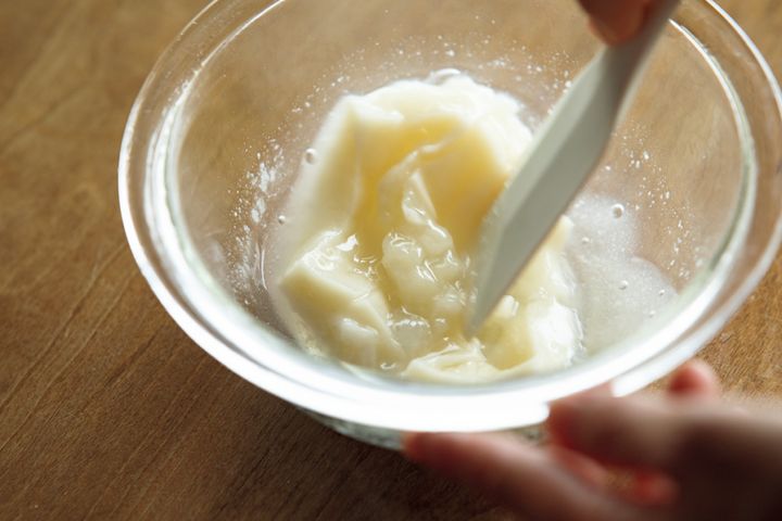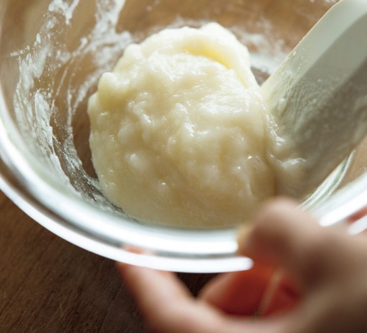 (3)(2)を耐熱のゴムべらでまんべんなく練り混ぜ、餅生地を作る。