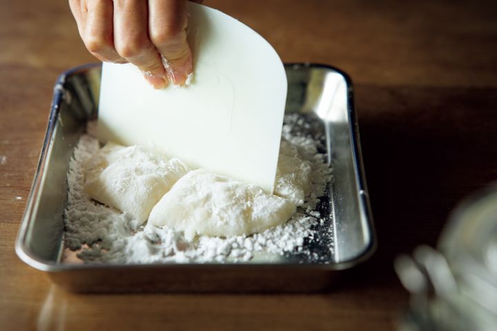 (4)バットに片栗粉を広げて(3)を入れ、表面にも片栗粉をまぶす。カードなどで4等分(約30ɡずつ)にする※ 。